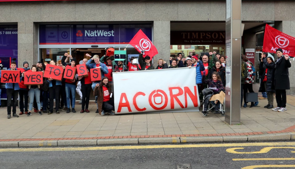 This was a huge win for tenants and for benefit claimants, with the policy change being extended to all UK branches within the RBS group (including NatWest, RBS, & Ulster Bank) and the third major bank that ACORN has taken on and forced to change policies in the last couple of years. This is what ordinary people can do when we come together to take direct action to better our lives.