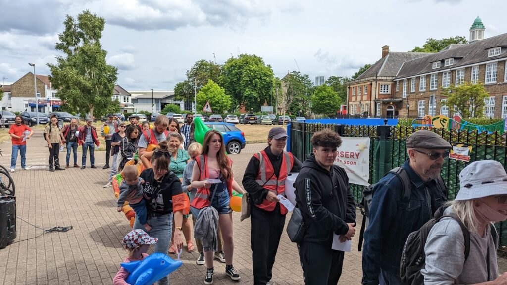 Our first action was a march on the pool with local pool users to deliver over fifty letters of demands straight to the reception. Local parents and children gathered outside the pool to hear speeches and play with inflatables.